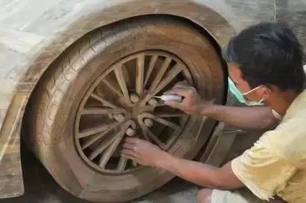 千萬別小看了坐在這個紅木跑車里的小哥,人家可是土豪!據說光制作該紅木跑車就花費了幾十萬,耗時半年多,真會玩